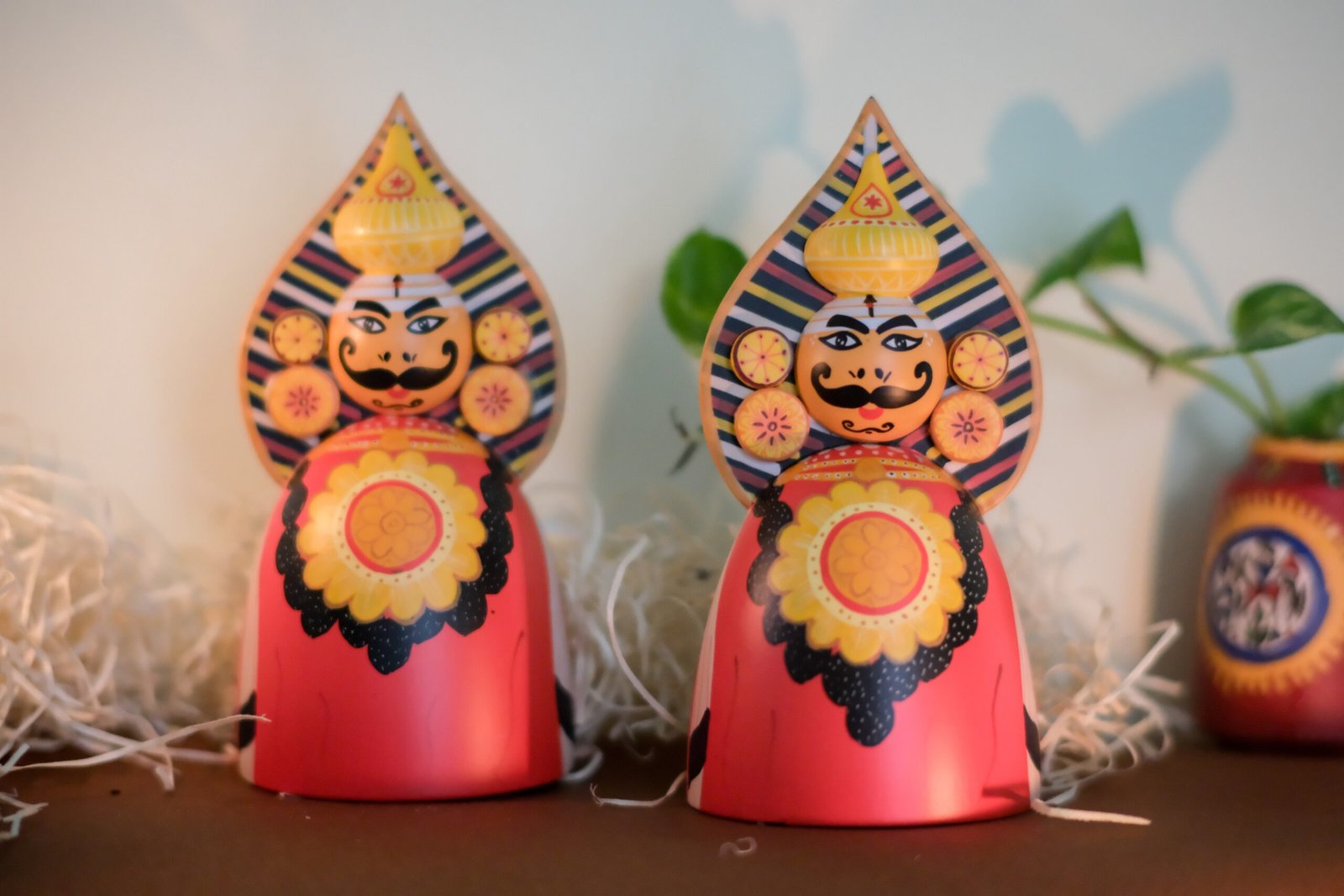 This handcrafted Wooden Yakshagana Doll, made by skilled Channapatna artisans, brings alive the vibrant folk theatre tradition of Karnataka. Decorated with colorful attire and expressive detailing, it reflects the grandeur of Yakshagana, a unique blend of dance, drama, and storytelling. Crafted using the eco-friendly lacquer-turnery technique of Channapatna, this doll is perfect for Navaratri Golu displays, cultural décor, or as a collectible art piece celebrating Karnataka’s heritage.