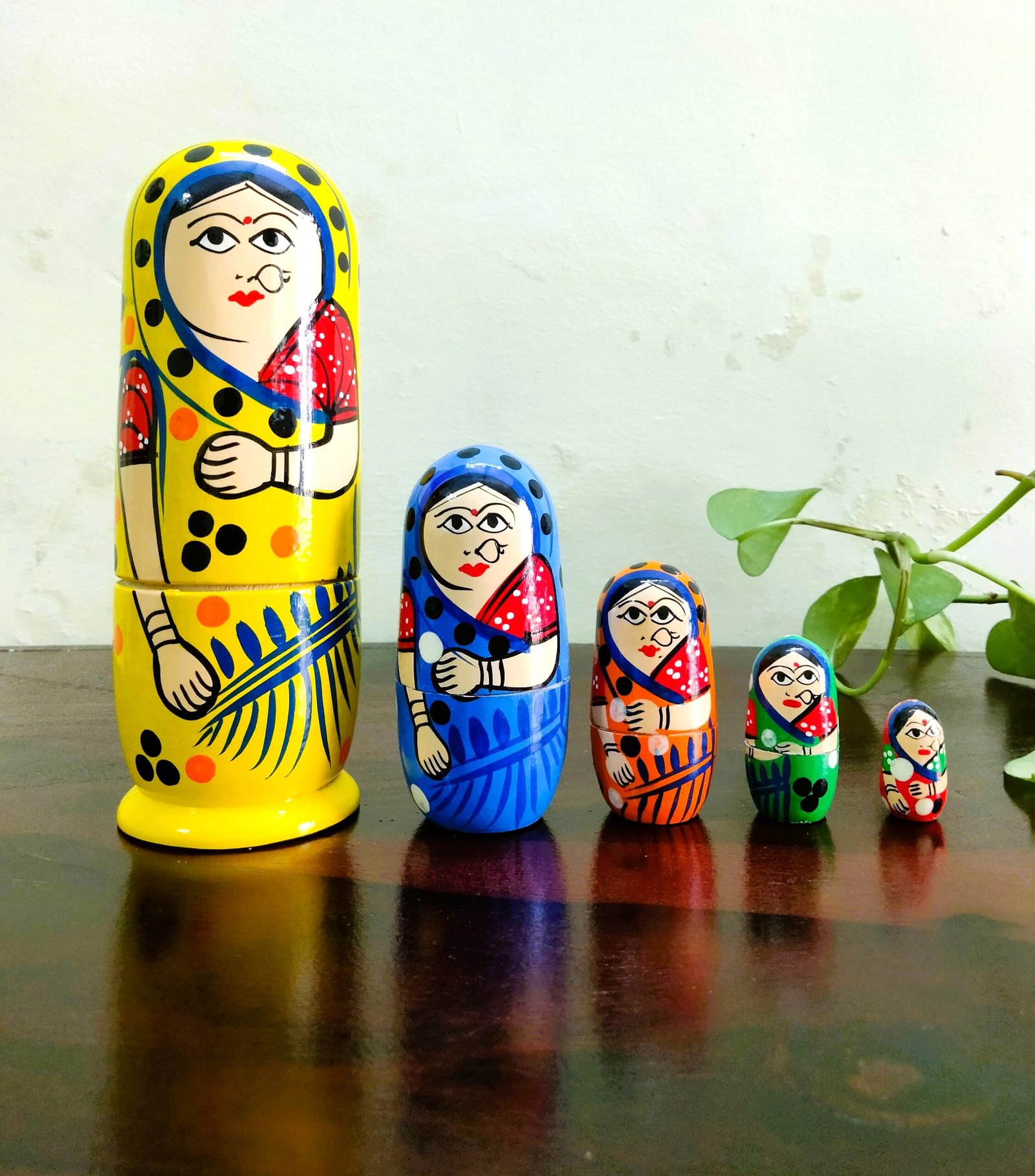 This exquisite Nesting Doll set handcrafted by artisans from Banaras (Varanasi) reflects the timeless charm of Indian folk art. Each doll is hand-painted in traditional Banarasi style with intricate patterns and cultural motifs, perfectly nested one inside the other. A beautiful blend of craftsmanship and storytelling, these dolls are ideal for home décor, gifting, educational use, and collectibles.